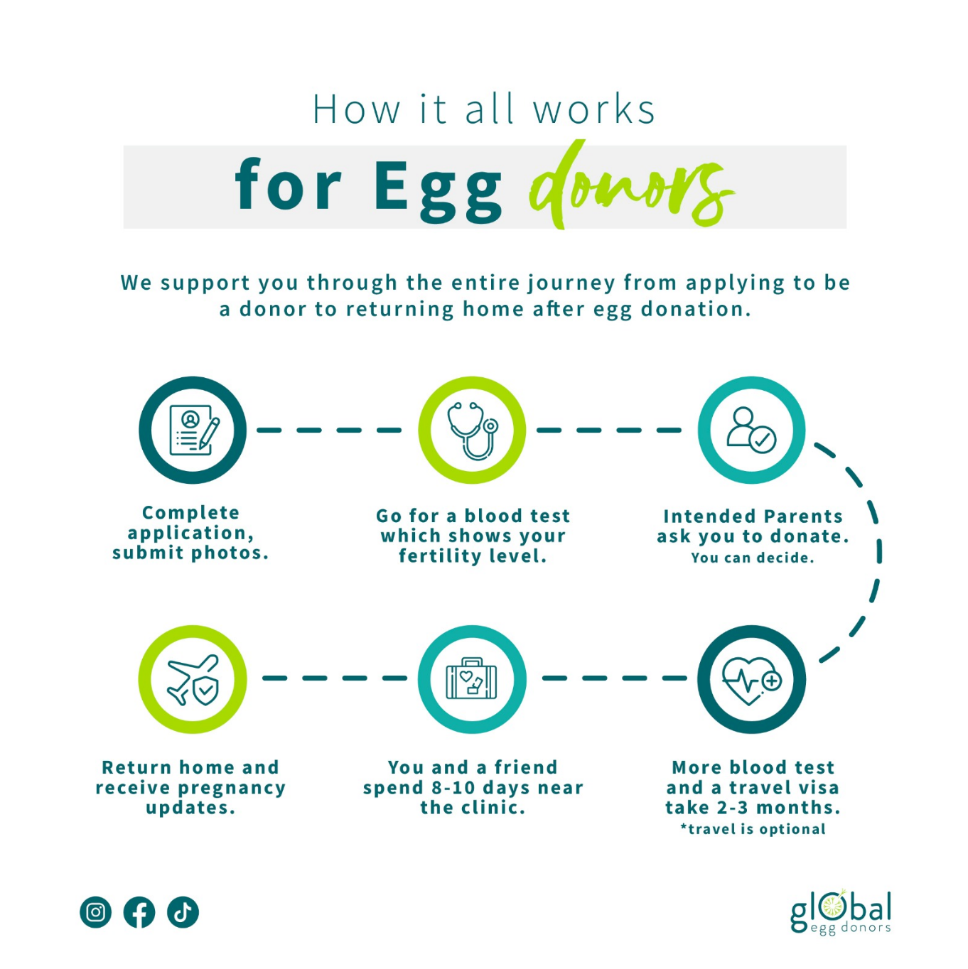 We support you through the entire journey from applying to be a donor to returning home after egg donation.